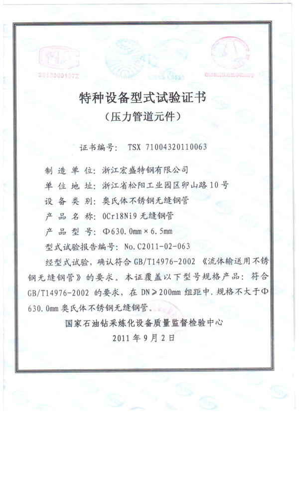 我們公司制造 牌號(hào):0Cr18Ni9 規(guī)格:630mm×6.5mm 的大口徑薄壁不銹鋼管(無縫),通過國(guó)家石油鉆采煉化設(shè)備質(zhì)量監(jiān)督檢驗(yàn)中心的特種設(shè)備形式試驗(yàn),證書編號(hào):TSX 71004320110063 代表著我們?cè)诖罂趶奖”诓讳P鋼管(無縫)的制造技術(shù)在國(guó)內(nèi)處于領(lǐng)先的水準(zhǔn)。目前也是浙江地區(qū)唯一可生產(chǎn)此類規(guī)格大口徑薄壁不銹鋼管(無縫)廠家。